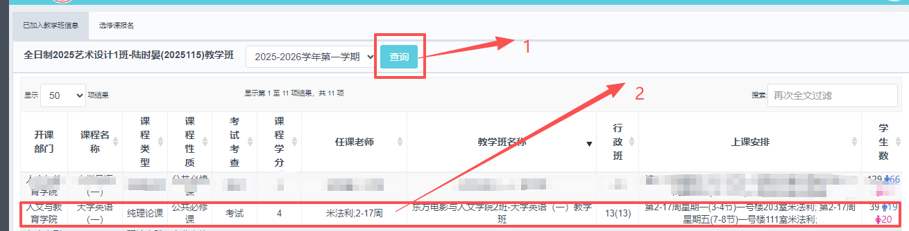 9.點(diǎn)擊“查詢”按鈕,確認(rèn)是否已經(jīng)加入教學(xué)班