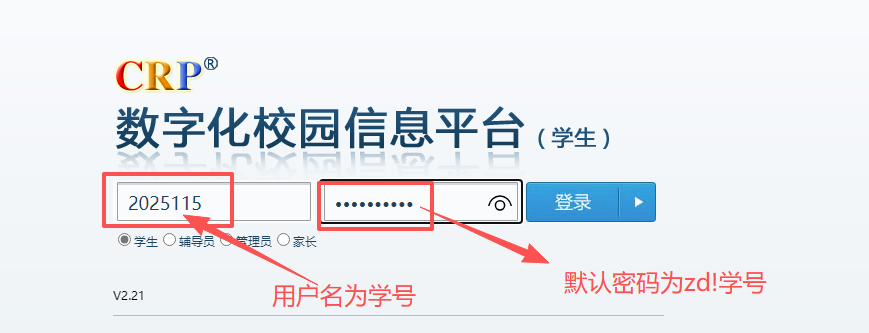5.輸入用戶名(用戶名為學(xué)號)及密碼(默認(rèn)密碼為zd!學(xué)號,如學(xué)號為250001則默認(rèn)密碼為zd!250001)