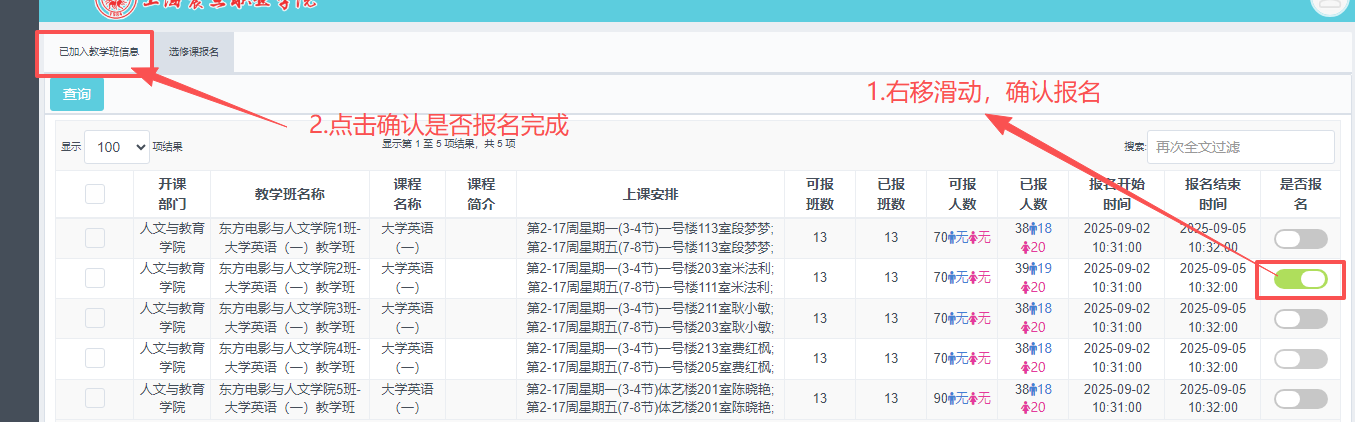 8.查看可報名教學(xué)班信息,選擇報名的教學(xué)班,右移滑動確認報名(注意:每門課程限報名一個教學(xué)班),報名后再點擊“已加入教學(xué)班信息”