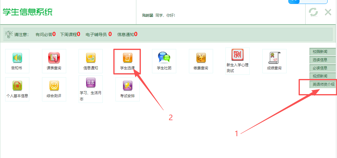 6.在選課前,可點擊“英語師資介紹”欄目,了解任課老師相關(guān)情況,然后點擊“學(xué)生選課”圖標,開始選課