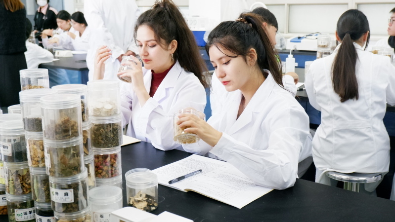 藥學(xué)專業(yè)學(xué)生在認(rèn)識各種藥材